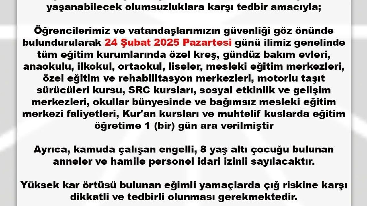 Rize Valiliği tarafından yapılan açıklamada, 23 Şubat Pazartesi günü il genelinde eğitim-öğretime 1 gün ara verildiği ifade edildi. Açıklamada, "İlimiz genelinde devam eden yoğun kar yağışı ve soğuk hava koşulları nedeniyle oluşabilecek buzlanma ve ulaşımda yaşanabilecek olumsuzluklara karsı tedbir amacıyla öğrencilerimiz ve vatandaşlarımızın güvenliği göz önünde bulundurularak 24 Şubat 2025 Pazartesi günü ilimiz genelinde tüm eğitim kurumlarında eğitim-öğretime 1 gün ara verilmiştir. Ayrıca kamuda çalışan engelli, 8 yaş altı çocuğu bulunan anneler ve hamile personel idari izinli sayılacaktır. Yüksek kar örtüsü bulunan eğimli yamaçlarda çığ riskine karşı dikkatli ve tedbirli olunması gerekmektedir" denildi.