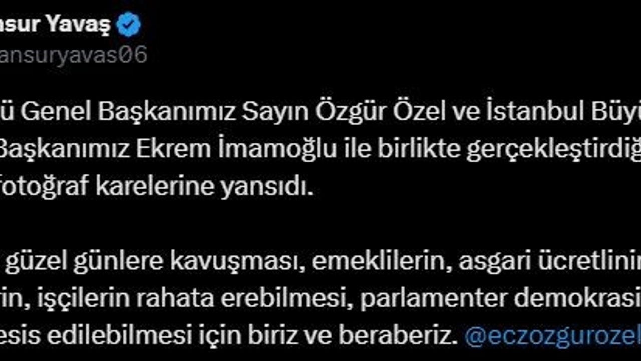 ABB Başkanı Yavaş, dün Ankara’da Cumhuriyet Halk Partisi (CHP) Genel Başkanı Özgür Özel ve İstanbul Büyükşehir Belediye (İBB) Başkanı Ekrem İmamoğlu ile bir araya gelmişti. Yavaş, buluşmanın ardından sosyal medya hesabından paylaşımda bulunarak, "Pazar günü Genel Başkanımız Sayın Özgür Özel ve İstanbul Büyükşehir Belediye Başkanımız Ekrem İmamoğlu ile birlikte gerçekleştirdiğimiz görüşme fotoğraf karelerine yansıdı. Ülkemizin güzel günlere kavuşması, emeklilerin, asgari ücretlinin, öğrencilerin, işçilerin rahata erebilmesi, parlamenter demokrasinin yeniden tesis edilebilmesi için biriz ve beraberiz" dedi.