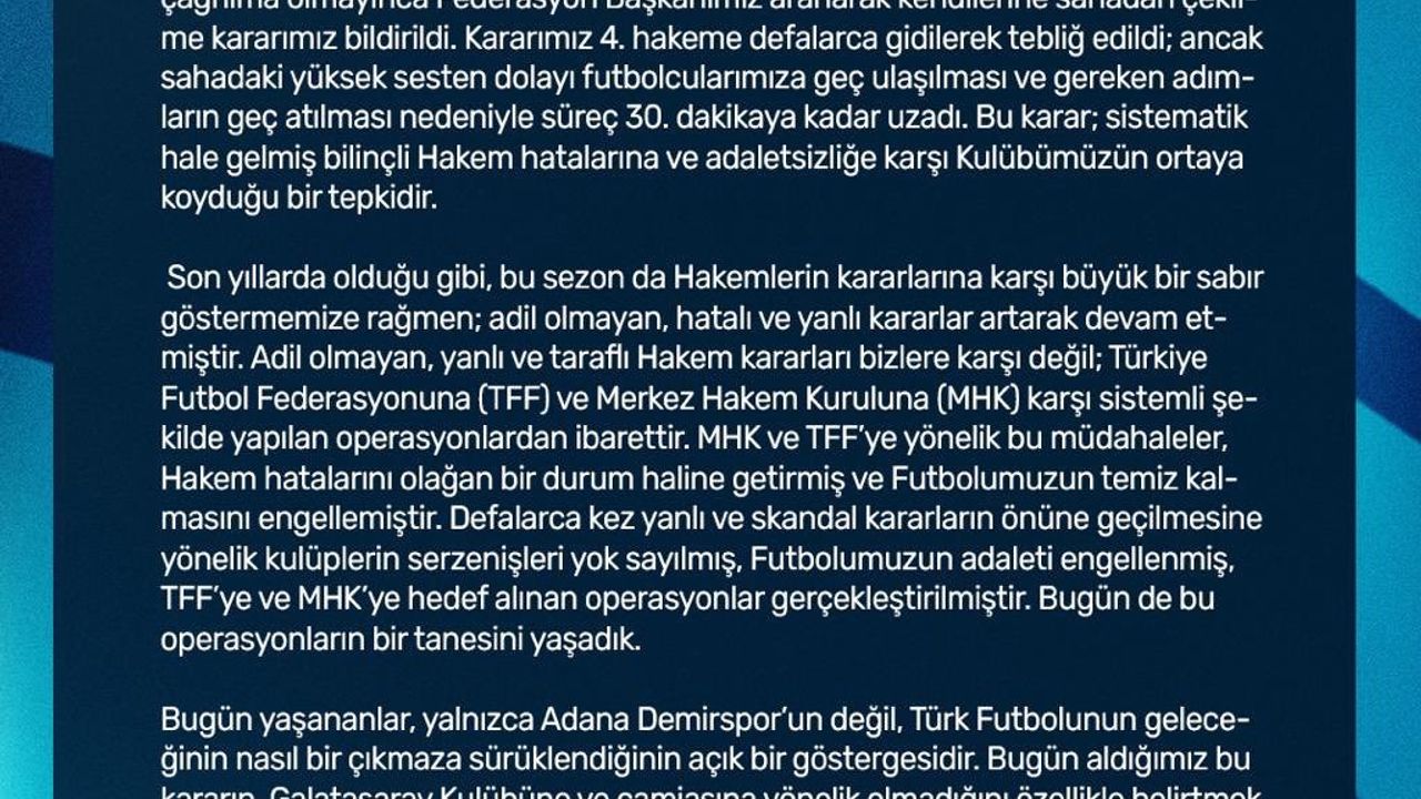 Adana Demirspor açıklamasında "Bugün yaşananlar, yalnızca Adana Demirspor’un değil, Türk Futbolunun geleceğinin nasıl bir çıkmaza sürüklendiğinin açık bir göstergesidir. Bugün aldığımız bu kararın, Galatasaray Kulübüne ve camiasına yönelik olmadığını özellikle belirtmek isteriz. Galatasaray gibi büyük bir Kulübün, maçın 12. dakikasında "kasten ayağını takarak" verilen bir penaltı kararına ihtiyacı olmadığı açıktır. Böylesine skandal kararlar, futbolun rekabet ruhuna ve adalet ilkesine ağır darbe vurmaktadır. Tüm bu düşüncelerimize ve yaklaşımımıza rağmen Galatasaray Spor Kulübü İkinci Başkanı Metin Öztürk ve Teknik Direktörü Okan Buruk’un maç sonrası açıklamalarını şiddetle kınadığımızı kamuoyuna bildiririz" sözleriyle devam etti.