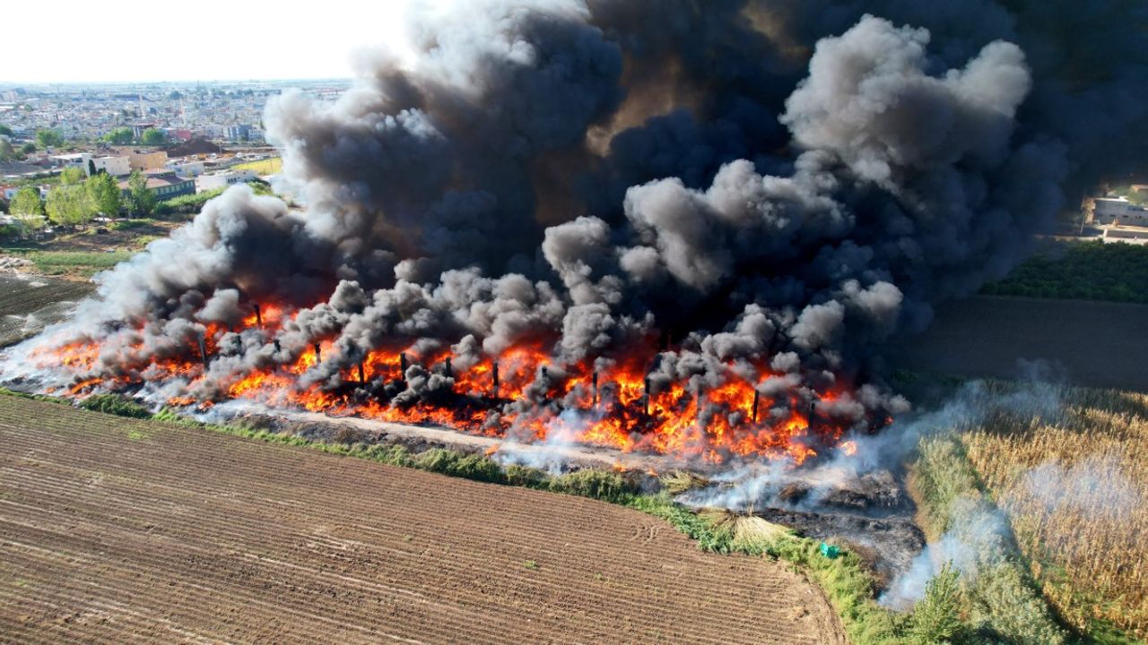 İtfaiye ekiplerinin müdahalesine rağmen bahçedeki kağıt ve plastik atıkları yanmaya devam ediyor. Bahçede başlayan ve siyah dumanın neredeyse tüm kentten görüldüğü yangın dron ile görüntülendi.