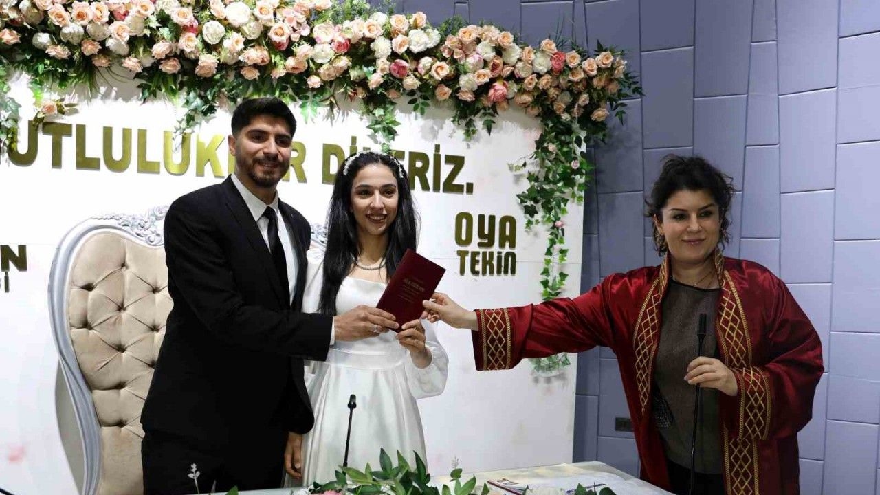 Nikah salonunda düzenlenen törenle dünya evine giren çiftler, 14 Şubat Sevgililer Günü’nde nikahlarını kıyarak çifte mutluluk yaşadıklarını ifade etti.