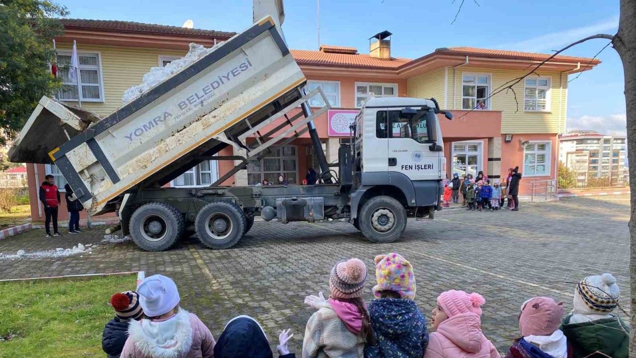 Trabzon’un Yomra ilçesinde ilçe merkezine kar yağmayınca belediye başkanı kamyonla anaokulu öğrencileri için yüksek kesimlerden kar getirdi.