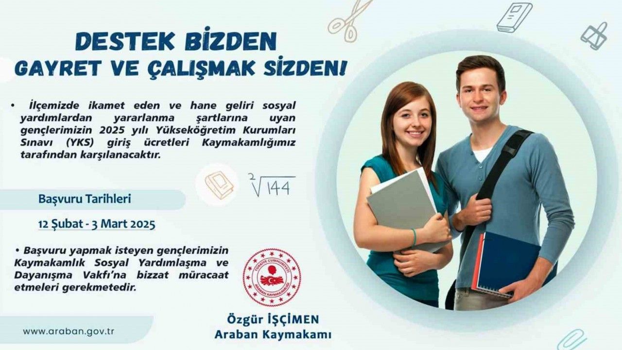 Gaziantep’in Araban ilçesinde ihtiyaç sahibi öğrencilerin Yükseköğretim Kurumları Sınavı (YKS) başvuru ücreti kaymakamlık tarafından karşılanacak.