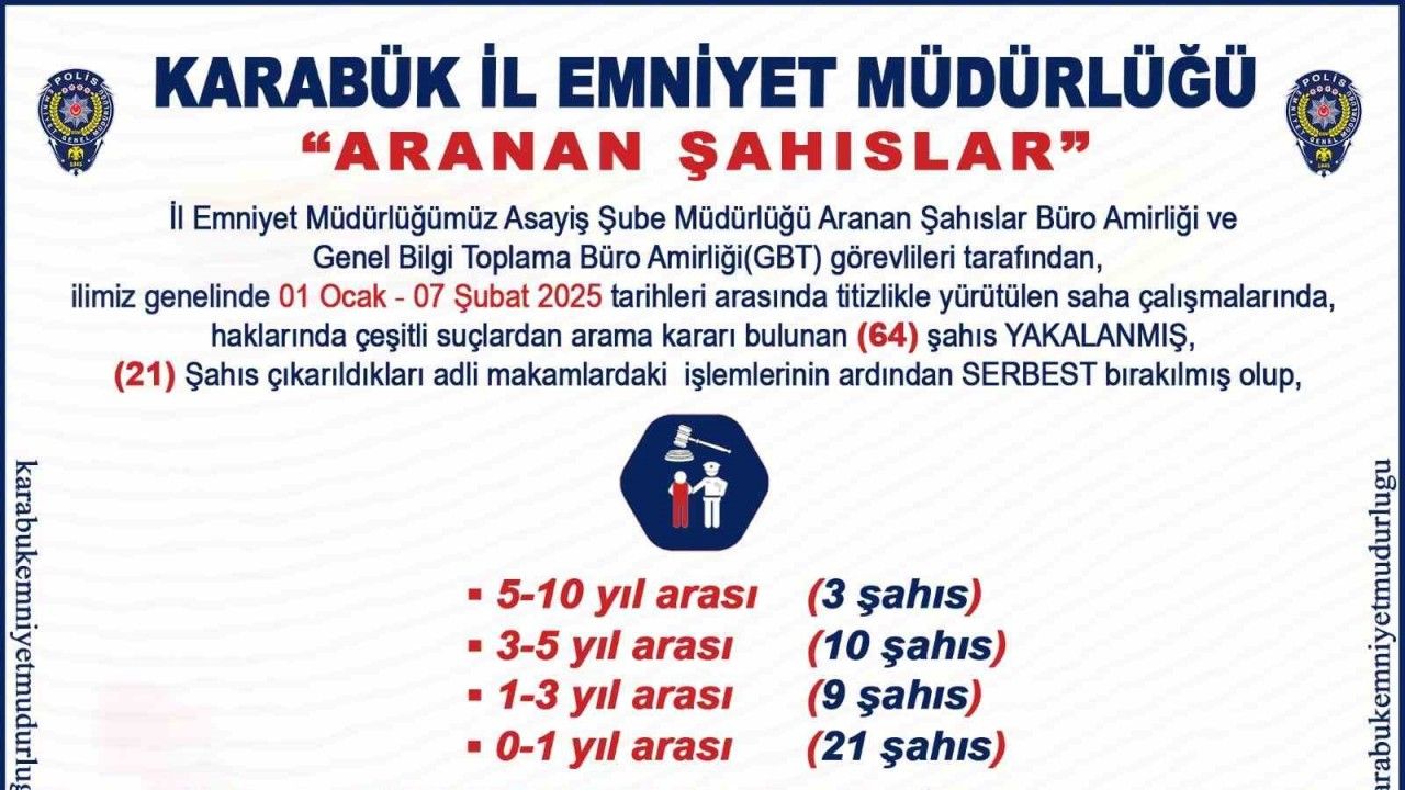 Karabük İl Emniyet Müdürlüğü Asayiş Şube Müdürlüğü Aranan Şahıslar Büro Amirliği ve Genel Bilgi Toplama Büro Amirliği (GBT) ekipleri tarafından il genelinde 1 Ocak - 7 Şubat tarihleri arasında yapılan saha çalışmalarında, haklarında çeşitli suçlardan aramaları bulunan 64 şahıs yakalandı. Yakalanan şahıslardan 21’i tamamlanan işlemlerinin ardından serbest bırakıldı. 0-1 yıl arası aranması olan 21 şahıs, 1-3 yıl arası 9 şahıs, 3-5 yıl arası aranması olan 10 şahıs, 5-10 yıl arası aranması olan 3 şahıs olmak üzere toplam 43 şahıs tamamlanan işlemlerinin ardından tutuklanarak Karabük Ceza İnfaz Kurumuna teslim edildi.