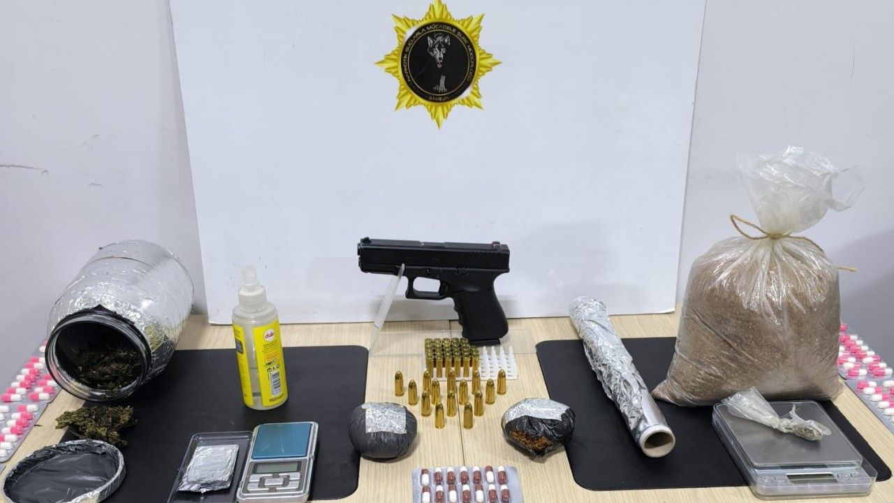 Edinilen bilgiye göre, Samsun’un Bafra ilçesi Altınyaprak Mahallesi’nde polis tarafından E.D. (41) isimli şahsın üzerinde ve ikametinde yapılan aramada, 2 kilo 250 gram bonzai (sentetik kannabinoid) elde edilebilen 75 ml sıvı madde, 780 gram tütüne emdirilmiş sentetik kannabinoid, 252 adet sentetik ecza, 100 gram skunk, 1,95 gram kenevir tohumu, 0,10 gram metamfetamin, 2 adet hassas terazi, 1 adet ruhsatsız tabanca ve 42 adet tabanca fişeği ele geçirildi.