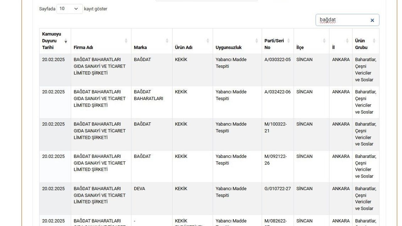Bağdat Baharatları markasının ’kekik’ ürününde yabancı madde tespit edildi.