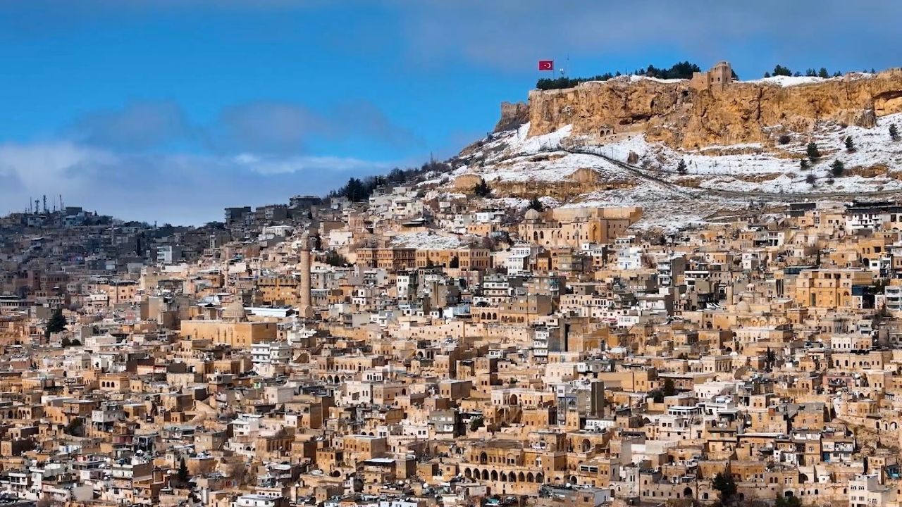Dron ile çekilen görüntülerde, Mardin’in dar sokakları ve özgün mimarisi karla örtünen benzersiz bir manzara sundu. Şehir, tarihi dokusunu koruyarak karla birleşen siluetiyle görsel bir şölen oluşturdu.