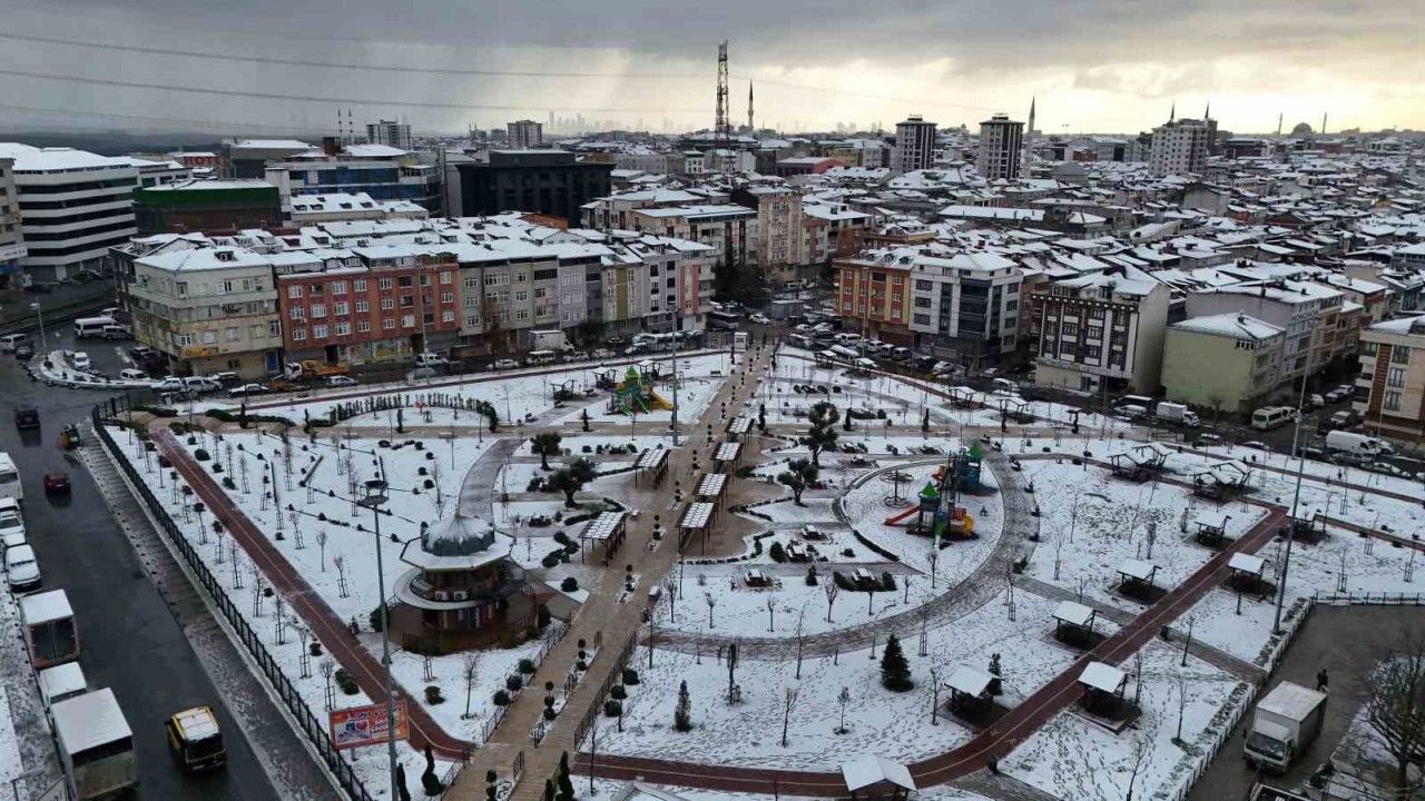 Meteorolojinin uyarılarının ardından İstanbul’da dün sabah saatlerinde başlayan ve ara ara yağmaya devam eden kar yağışı, etkisini yüksek kesimlerde sürdürdü. Sultangazi kar yağışı nedeniyle beyaza büründü. Yer, araç ve çatıların üzeri kar tabakasıyla kaplanırken, ortaya çıkan görsel şölen dron kamerasına yansıdı.