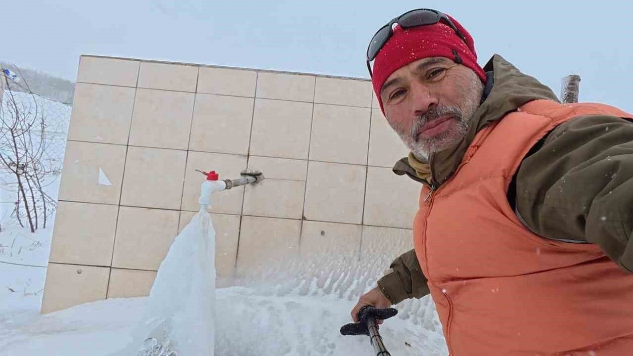 Tokat’ın Reşadiye ilçesinde etkili olan soğuk hava nedeniyle bir çeşmenin akan suyu donarak buz tuttu.