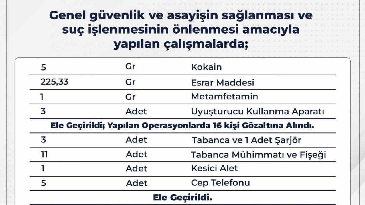 Polis ve jandarma ekipleri tarafından son 2 haftada aranan şahıslara yönelik düzenlenen operasyonlarda, haklarında çeşitli suçlardan kesinleşmiş hapis cezası sebebiyle arama kaydı bulunan 13, ifadeye yönelik arama kaydı bulunan 47 olmak üzere toplam 60 kişi yakalandı. Genel güvenlik ve asayişin sağlanması ve suç işlenmesinin önlenmesi amacıyla yapılan çalışmalarda 5 gram kokain, 225.33 gram esrar maddesi, 1 gram metamfetamin, 3 adet uyuşturucu kullanım aparatı ele geçirildi. Yapılan operasyonlarda 16 kişi gözaltına alındı.