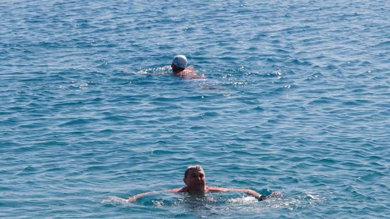 Son iki gündür soğuk hava etkisindeki Antalya’da bazı vatandaşlar ve yabancı turistler ısınmak için sıcaklığı 18 derece olan denize girdi.