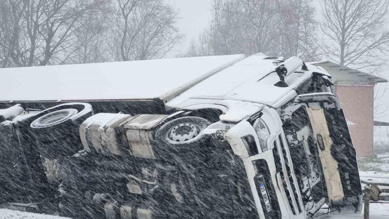 Karacabey ilçesi Uluabat mevkiinde de yoğun kar yağışı sebebiyle Bursa - İzmir Yolunun bir bölümü karla kaplanınca Bursa istikametinden Karacabey istikametine seyreden 20 AHS 587 plakalı tır karda kayıp orta refüje düştü. Yan yatan tırın sürücüsü kazadan yara almadan kurtuldu. Olayla ilgili jandarma ekipleri tahkikat başlattı.