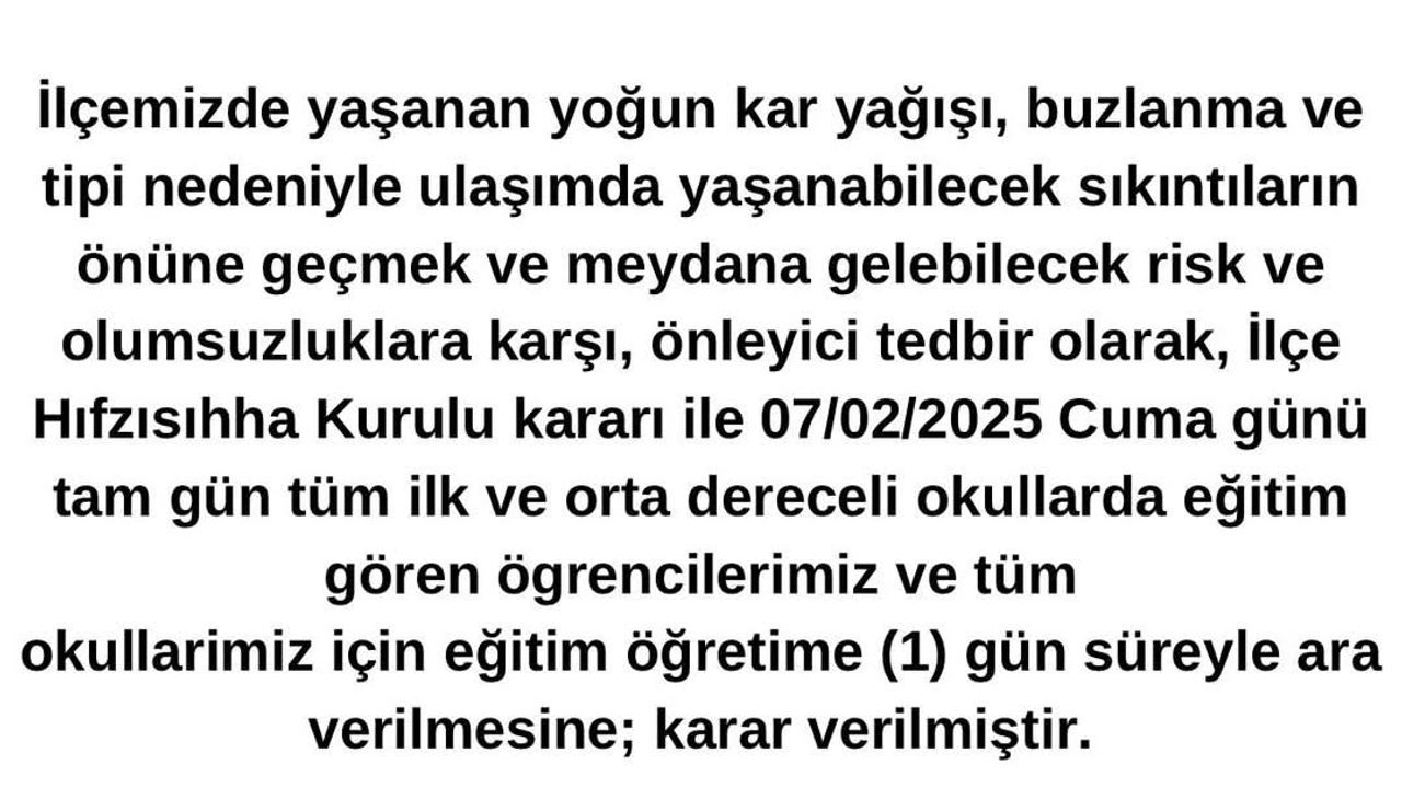 Ayrıca Orhaneli Kaymakamlığı’ndan yapılan açıklamada ise, "İlçemiz genelinde olumsuz hava şartlarının devam edeceği ve buzlanma tehlikesinin oluşacağının değerlendirilmesi nedeniyle 7 Şubat 2025 Cuma günü, ilçemizde özel eğitim ve taşımalı eğitim öğrencilerine 1 gün ara verilmiştir" denildi.