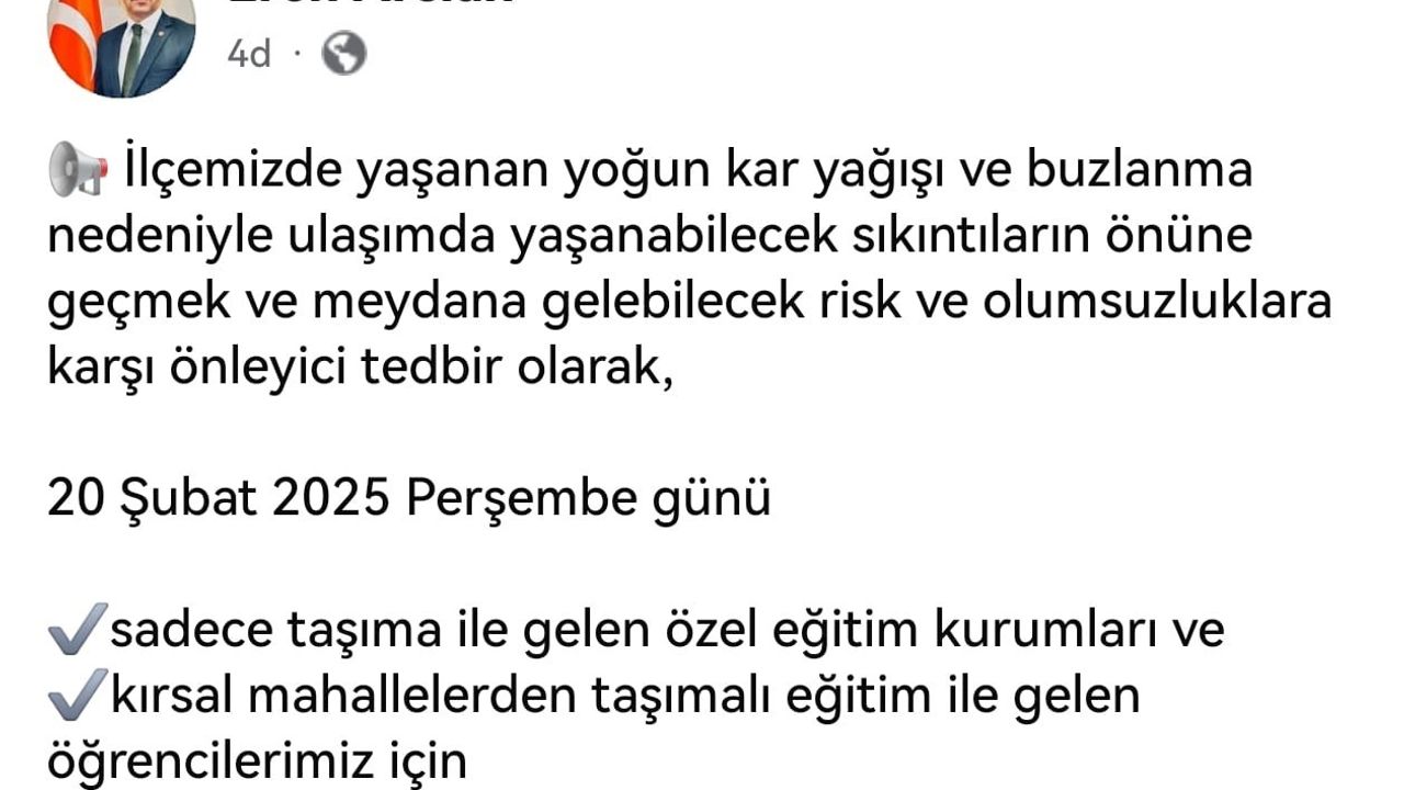 İnegöl Kaymakamı Eren Arslan’ın sosyal medya hesabından yaptığı paylaşımda, "İlçemizde yaşanan yoğun kar yağışı ve buzlanma nedeniyle ulaşımda yaşanabilecek sıkıntıların önüne geçmek ve meydana gelebilecek risk ve olumsuzluklara karşı önleyici tedbir olarak, 20 Şubat 2025 Perşembe günü resmi olarak taşıma çerçevesinde, özel eğitim ve kırsal mahallelerden gelen öğrencilerimiz için eğitim öğretime (1) gün süreyle ara verilmiştir" denildi.