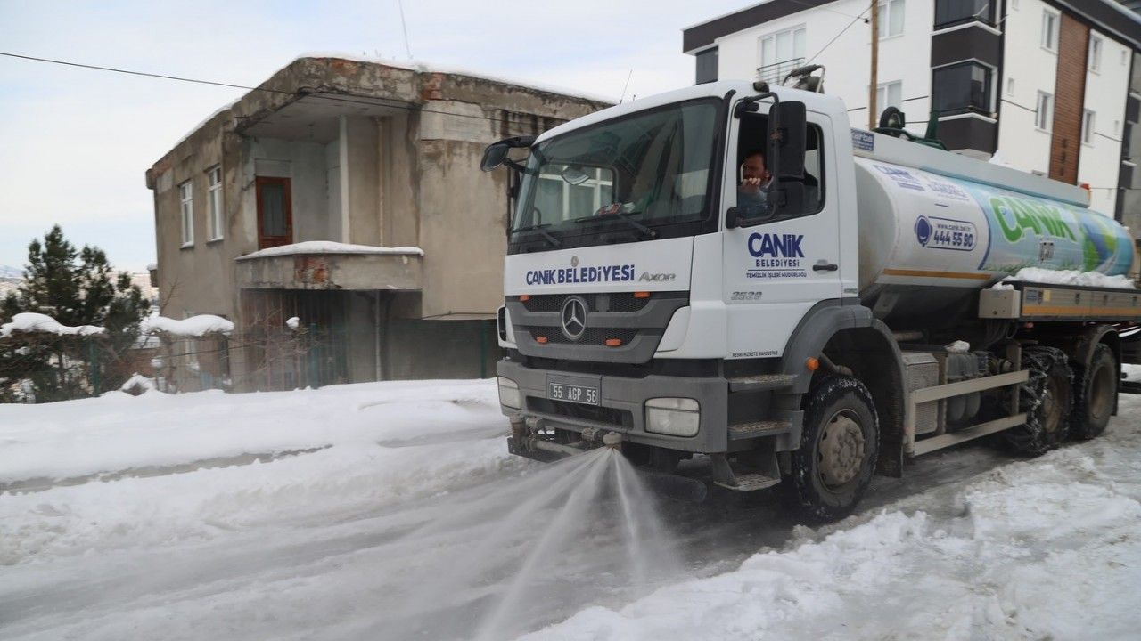 Canik’te buzlanma ve don olaylarına karşı solüsyon çalışmalarını sürdürdüklerini kaydeden Başkan İbrahim Sandıkçı, "İlçemizde buzlanma ve don olaylarına karşı solüsyon uygulama çalışmalarımız sürüyor. İlçemiz ana arterler, ara yollar, okul bahçeleri ve çevreleri ile ortak yaşam alanlarında oluşan buzlu alanları, solüsyon uygulama ve küreme çalışmalarıyla bertaraf etmeye devam ediyoruz. Kar yağışlarının etkisi ilçemizde bitene değin, tüm ekiplerimizle birlikte karla mücadele çalışmalarımızı kesintisiz bir şekilde sürdüreceğiz" şeklinde konuştu.