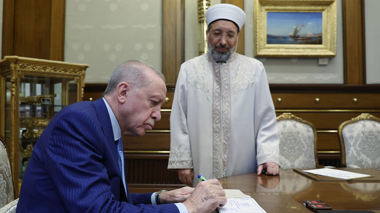 Cumhurbaşkanı Erdoğan, Cumhurbaşkanlığı Külliyesi’nde, Diyanet İşleri Başkanı Safi Arpaguş’u kabul etti. Erdoğan, kurban vekaletini Türkiye Diyanet Vakfına verdi ve bağış makbuzunu imzaladı.