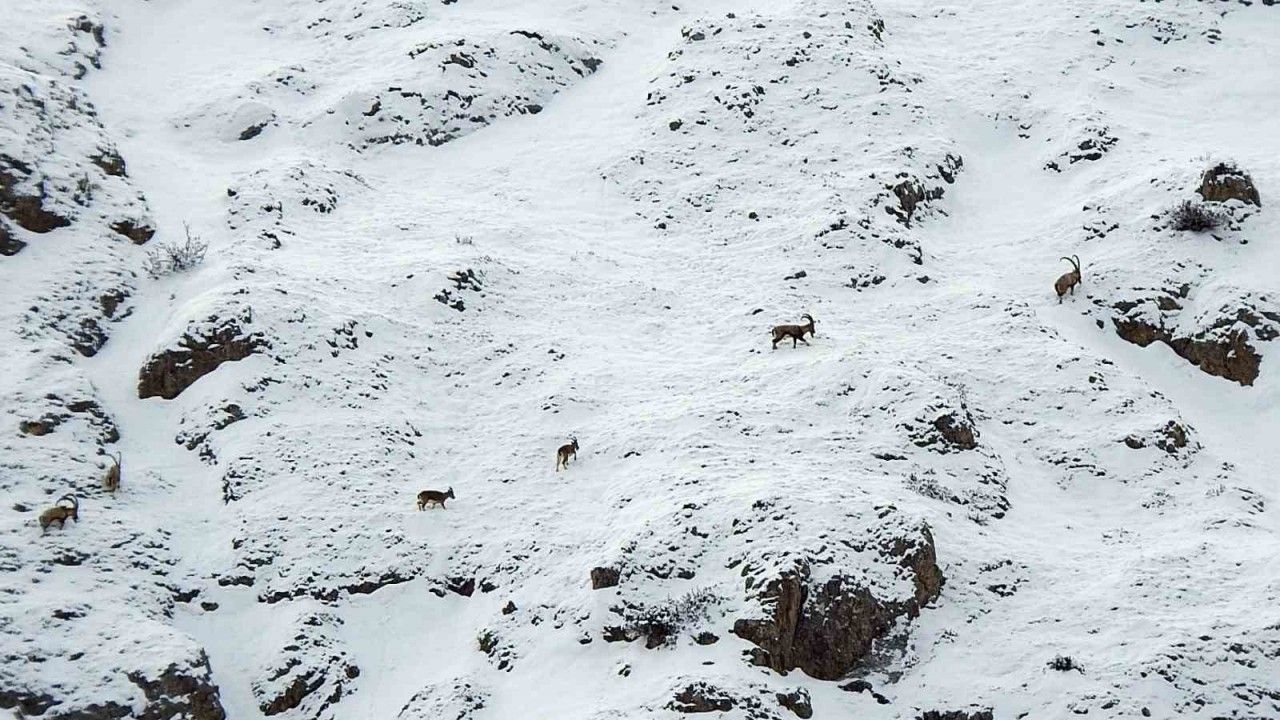 Erzincan’da Munzur Dağlarının karlı zirvelerinde dağ keçileri görüntülendi.