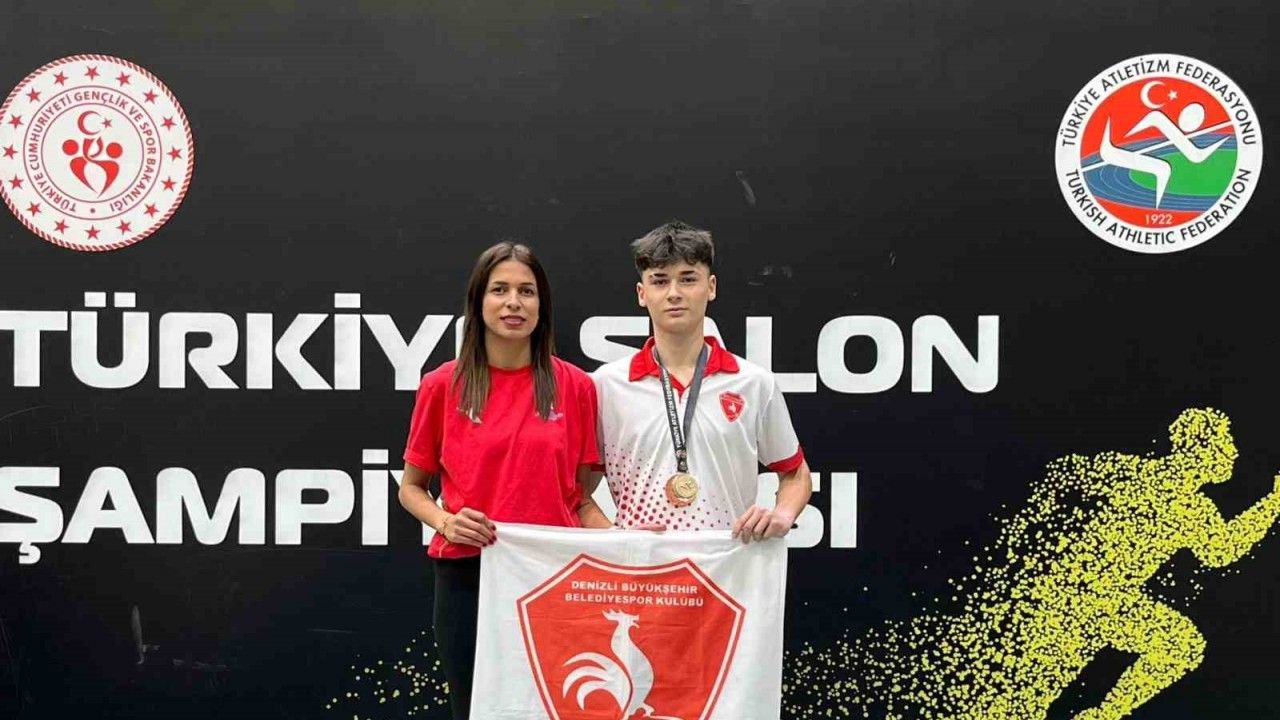 Denizli Büyükşehir Belediyesporlu Arda Bakırhan, U-16 Türkiye Salon Şampiyonası Erkekler Üç Adım Atlama kategorisinde Türkiye şampiyonluğunu kazandı.
