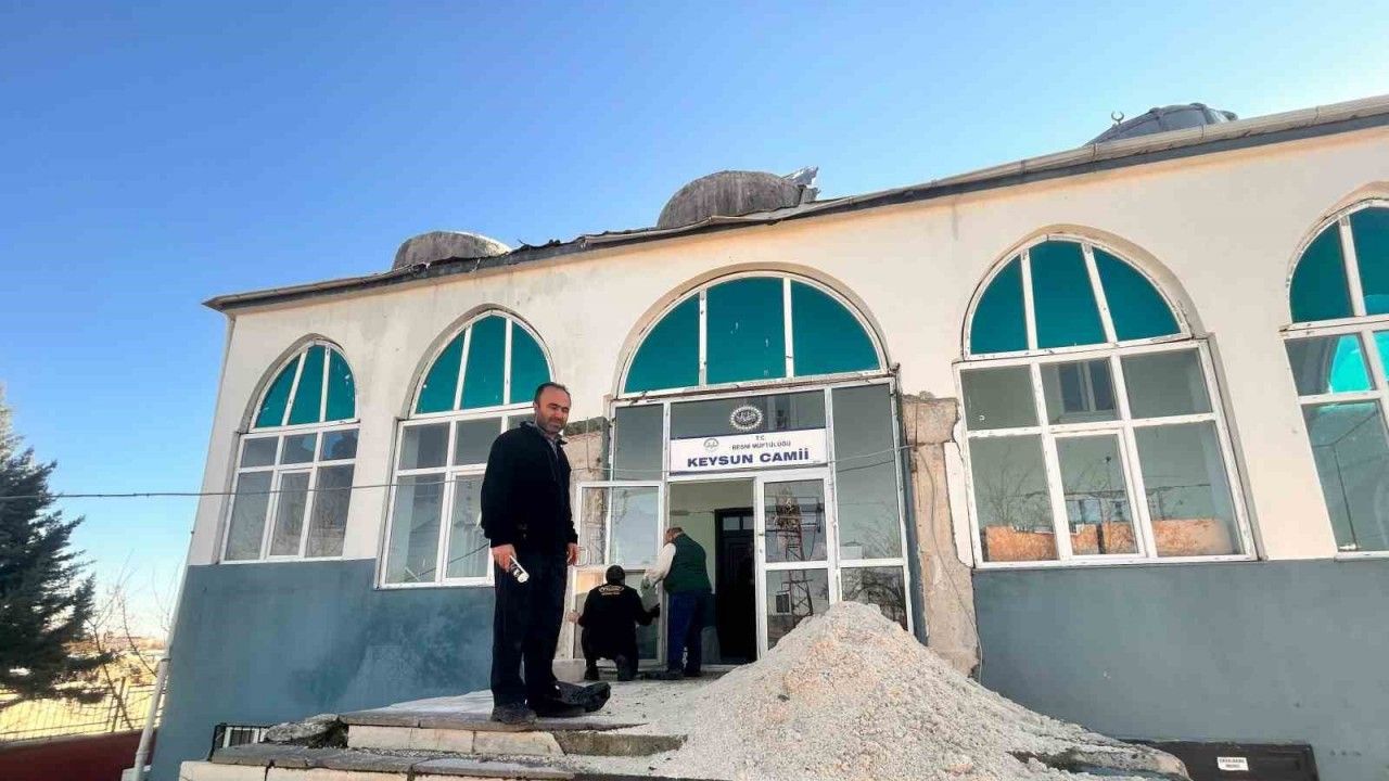 Adıyaman’ın Besni ilçesine bağlı Çakırhüyük Beldesi’nde, 6 Şubat depremlerinde hasar gören Keysun Camii, din görevlilerinin gönüllü çalışmalarıyla onarılıyor.
