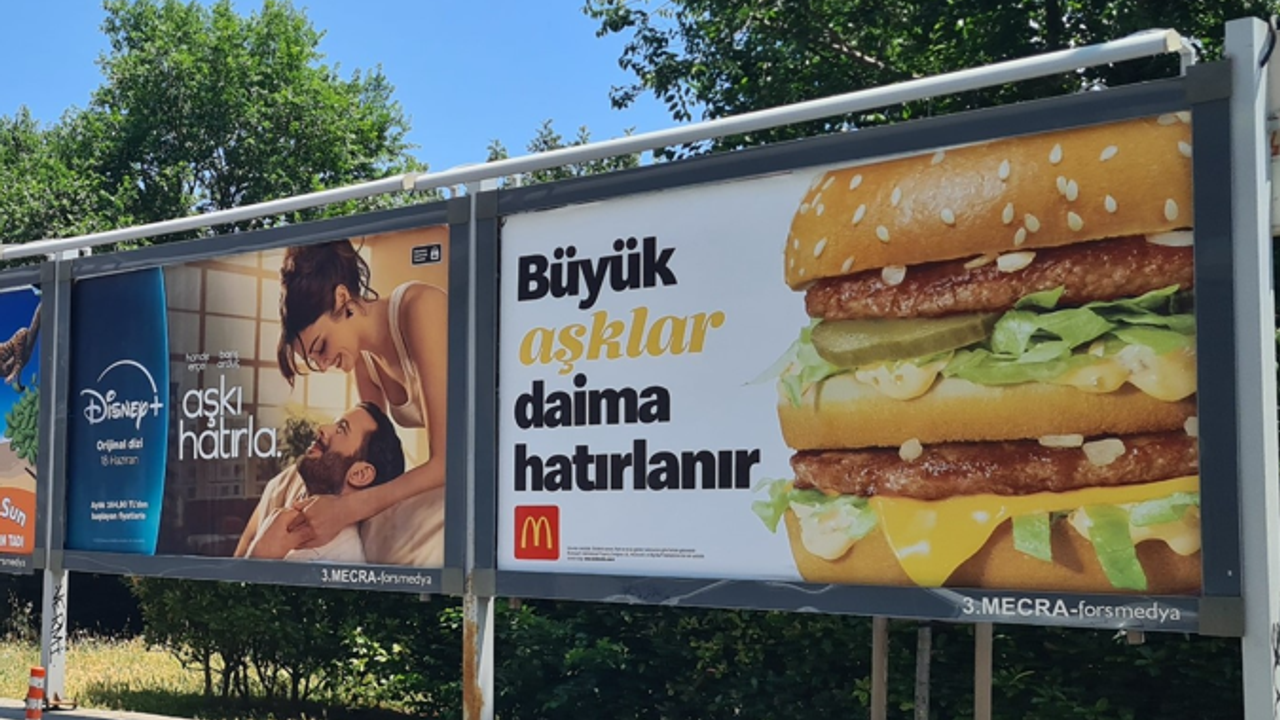 Yan yana yer alan iki billboardda, bir yanda Disney+ dizisi Aşkı Hatırla’nın başrolleri romantik bir sahnede görenleri selamlarken, diğer yanda McDonald’s'ın ikonik Big Mac’i “Büyük Aşklar Daima Hatırlanır” sloganıyla boy gösteriyor. Ortaya hem samimi hem de zekice kurgulanmış bir görsel iletişim çıkıyor.
