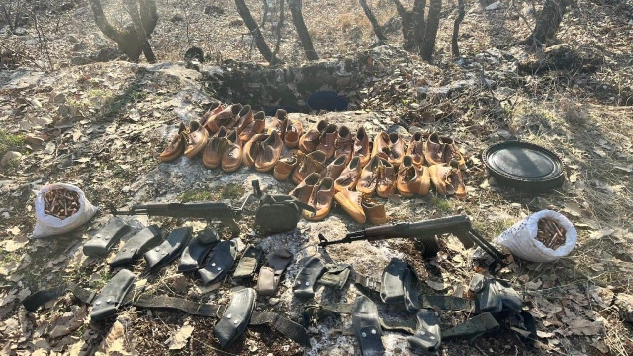 Açıklamada, istihbari bilgi üzerine icra edilen operasyon kapsamında bölücü terör örgüt (BTÖ) mensuplarına ait 2 adet jelikan içerisine gömülü vaziyette, 2 adet kalaşnikof piyade tüfeği, tüfeğe ait 2 adet şarjör, 700 adet Bixi mühimmatı, 17 çift ayakkabı, 17 adet şarjör kütüklüğü, 3 adet palaska ve 1 adet siyah el çantası ele geçirildiği ifade edildi.
