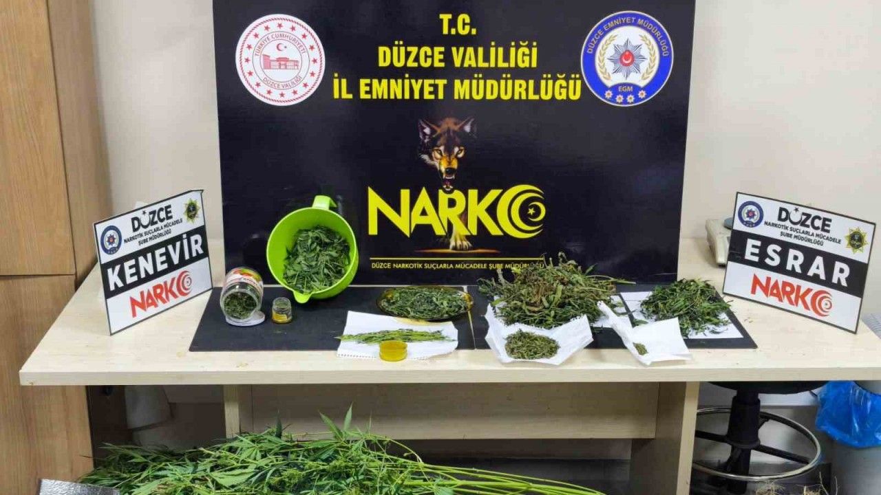Düzce Cumhuriyet Başsavcılığının koordinesinde Narkotik Suçlarla Mücadele Şube Müdürlüğü ekiplerince bir ikamette özel yöntemlerle uyuşturucu madde üretildiğine dair bilgi edinilmesi üzerine operasyon düzenlendi. Operasyonda 350 gram esrar, 11 kök Hint Keneviri ve esrar maddesi üretmek için kullanılan muhtelif teknik malzemeler ele geçirildi. Uyuşturucu madde ticareti yapmak ve 2313 sayılı yasaya muhalefet suçundan işlem yapılan 4 ayrı suç kaydı bulunan M.E.T. (36) isimli şahıs Cumhuriyet Başsavcılığı tarafından gözaltına alındı.