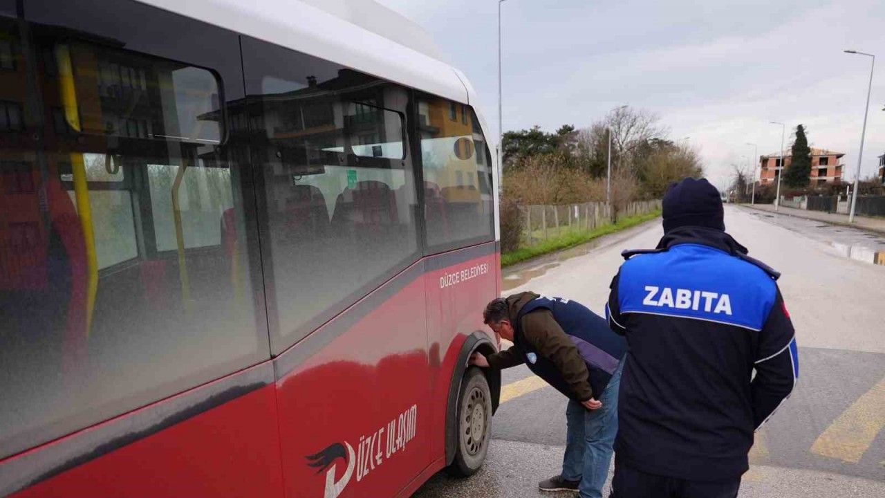 Düzce Belediyesi Zabıta Müdürlüğü ve Emniyet Müdürlüğü Trafik Şube ekipleri iş birliğinde halk otobüslerinin kış lastikleri denetlendi.