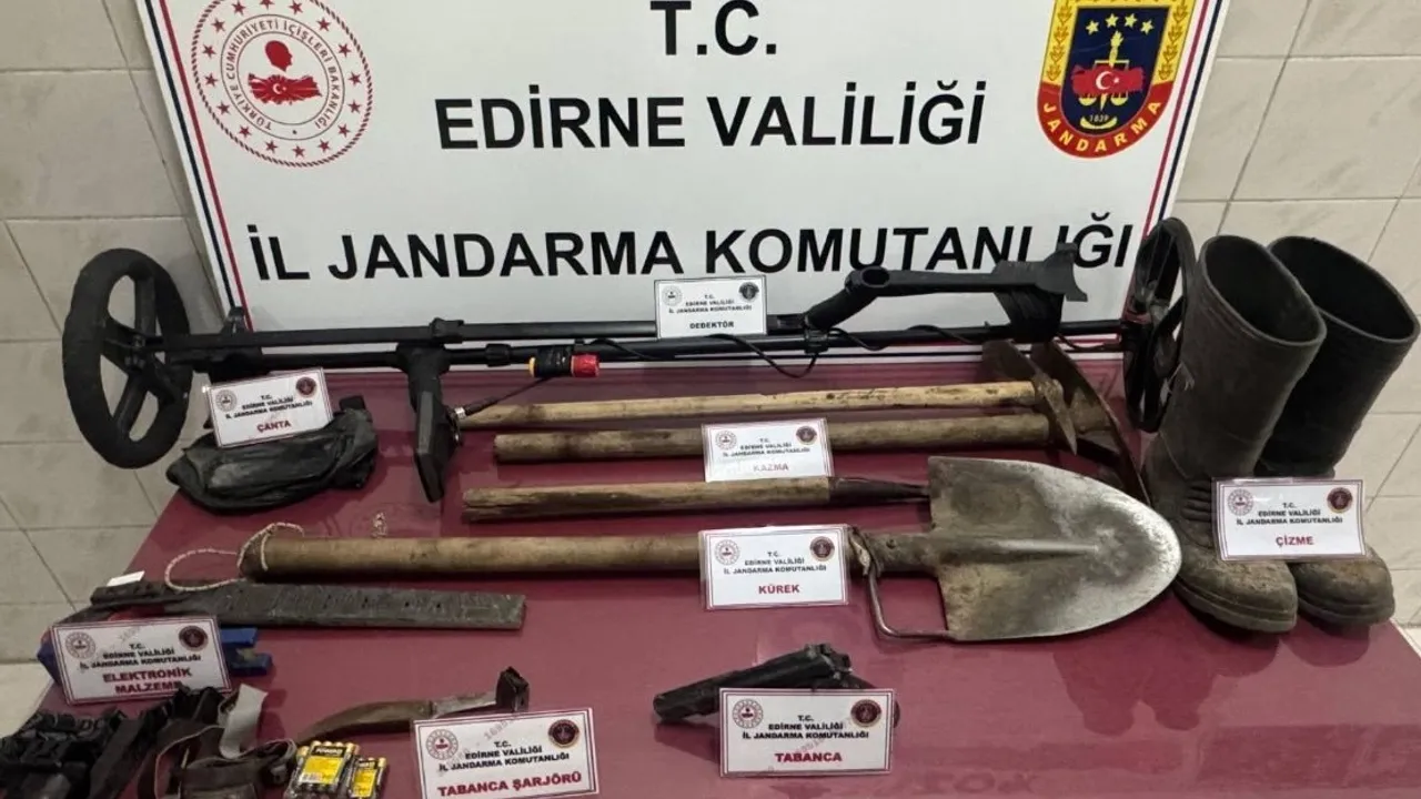 Yakalanan şahısların üzerinde ve olay yerinde yapılan aramada; baş feneri, ruhsatsız tabanca şarjörü, av tüfeği, av tüfeği fişeği, kalem pil, çizme, el testeresi, yağmurluk, su terazisi, çanta, çekme halatı, elektrik bandı, eldiven ve nacak gibi çok sayıda kazı aleti ele geçirildi.