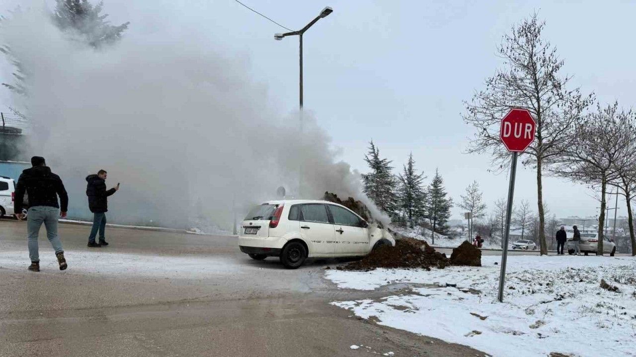Bolu’da seyir halindeki otomobilde çıkan yangın, iş makinesi şoförünün ekskavatörle toprak atmasıyla söndürüldü.