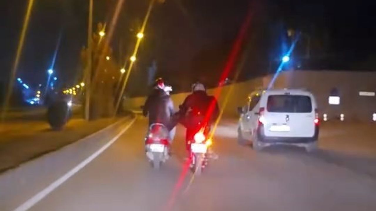 Olay, merkez Atatürk Bulvarı’nda meydana geldi. Edinilen bilgiye göre, plakası tespit edilemeyen bir motosiklet sürücüsü, seyir halinde olan başka bir motosikleti ayağı ile ittirerek ilerletti. Motosikletin ayakla ittirilerek ilerlemesine tanık olan vatandaşlar, şaşkınlıklarını gizleyemedi. İki motosiklet sürücüsü, bu davranışlarıyla trafikte kazaya davetiye çıkardı.