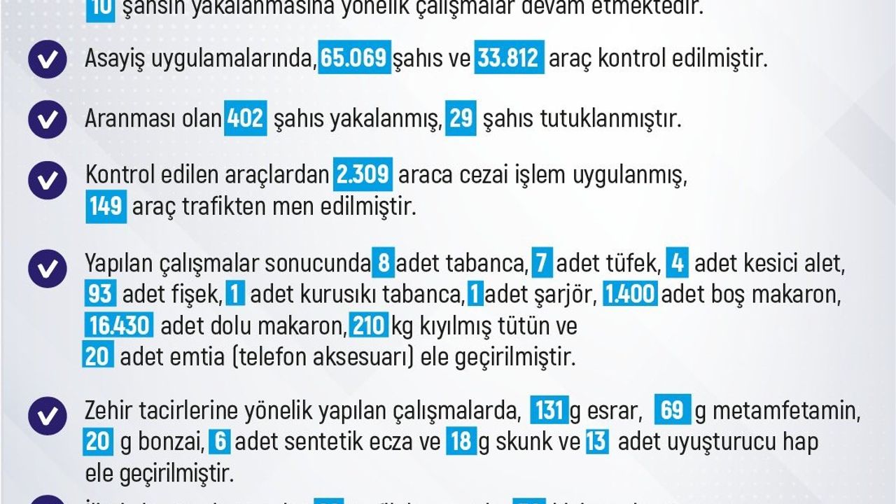 Yapılan çalışmalar sonucunda 8 adet tabanca, 7 adet tüfek, 4 adet kesici alet, 93 adet fişek, 1 adet kurusıkı tabanca, 1 adet şarjör, bin 400 adet boş makaron, 16 bin 430 adet dolu makaron, 210 kilo kıyılmış tütün ve 20 adet telefon aksesuarı ele geçirildi. Zehir tacirlerine yönelik yapılan çalışmalarda, 131 gram esrar, 69 gram metamfetamin, 20 gram bonzai, 6 adet sentetik ecza ve 18 gram skunk ve 13 adet uyuşturucu hap ele geçirildiği bildirildi.