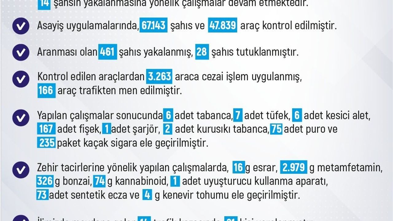 Yapılan çalışmalar sonucunda 6 adet tabanca, 7 adet tüfek, 6 adet kesici alet, 167 adet fişek, 1 adet şarjör, 2 adet kurusıkı tabanca, 75 adet puro ve 235 paket kaçak sigara ele geçirildi. Zehir tacirlerine yönelik yapılan çalışmalarda ise 16 gram esrar, 2.979 gram metamfetamin, 326 gram bonzai, 74 gram kannabinoid, 1 adet uyuşturucu kullanma aparatı, 75 adet sentetik ecza ve 4 gram kenevir tohumunun ele geçirildiği aktarıldı.