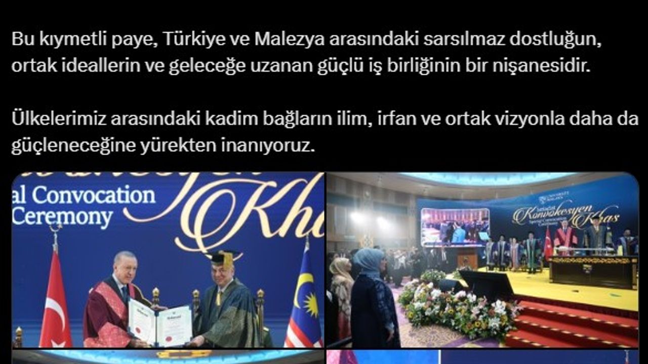 Emine Erdoğan, sosyal medya hesabından yaptığı paylaşımda, "Resmi ziyaretimiz kapsamında Malezya’nın başkenti Kuala Lumpur’da Perak Sultanı Nazrin Şah tarafından Cumhurbaşkanımız Recep Tayyip Erdoğan’a tevdi edilen Fahri Doktora Beratı’na tanıklık etmekten büyük onur duyduk" ifadelerini kullandı.