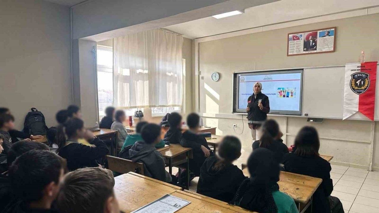 Erzincan’da polis ekiplerince, kent merkezinde bulunan okullarda kişisel güvenlik ve suçtan korunma yöntemleri, güvenli internet kullanımı, trafik güvenliği ile çocuk polisinin görevleri konularında bilgilendirme yapıldı.