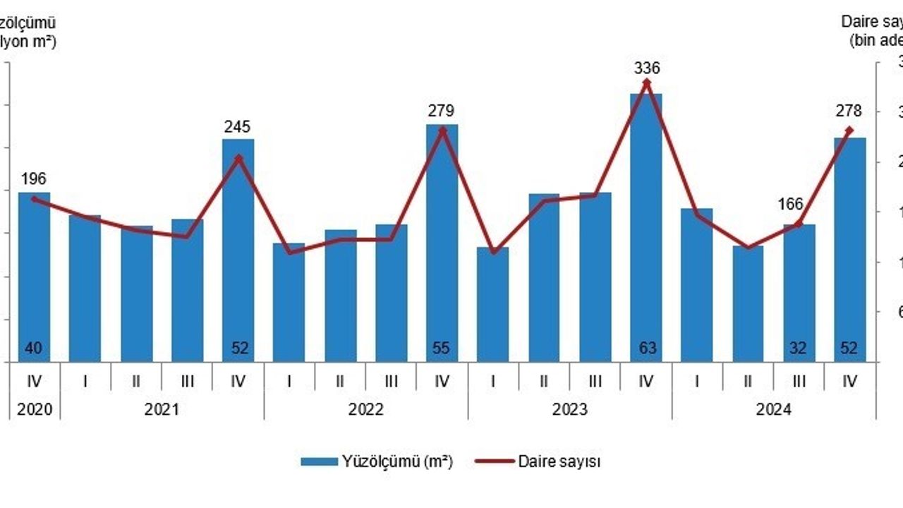 TÜİK, ‘Yapı İzin İstatistikleri, IV. Çeyrek: Ekim-Aralık, 2024’ verilerini yayımladı. Paylaşılan bilgiye göre, yurt genelinde yapı ruhsatı verilen binaların yüzölçümü yüzde 16,5 azaldı. Bir önceki yılın aynı çeyreğine göre, 2024 yılı 4’üncü çeyreğinde belediyeler tarafından yapı ruhsatı verilen bina sayısı yüzde 16,7, daire sayısı yüzde 17,4 ve yüzölçüm yüzde 16,5 azaldı. Eskişehir’de ise yapı ruhsatı verilen daire sayısı 3 bin 193, yapı kullanma izin belgesi verilen daire sayısı da 3 bin 54 oldu.