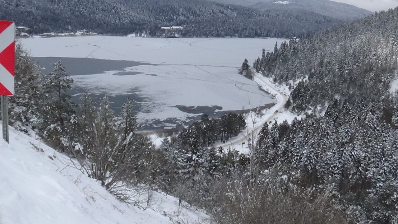Bolu’nun doğa harikası Abant Gölü Milli Parkı’nda, kar yağışı aralıklarla etkisini sürdürüyor. Soğuk havanın etkisiyle tamamen buz tutan gölde, yeşil alanlarda kar kalınlığı 20 santimetreye ulaştı. Hava sıcaklığının eksi 10 derece olarak ölçüldüğü bölgede donmuş göl, ziyaretçilere kartpostallık manzaralar sundu.