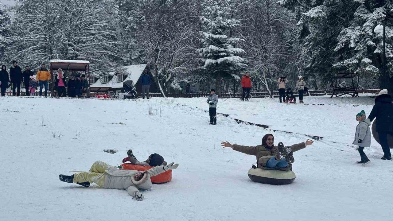 Kent merkezine 13 kilometre uzaklıkta bulunan Bolu’nun incisi olarak tabir edilen Gölcük Tabiat Parkı, hafta sonu tatilinde ziyaretçilerle doldu. Geçtiğimiz 3 gün boyunca aralıklarla kar yağışının etkili olduğu tabiat parkında kar kalınlığı 10 santimetreye ulaştı. Göl kıyısında bulunan rampada tabiat parkına gelen tatilciler tarafından kayak pisti oluşturuldu. Şambrellerini eline alan tatilciler, Gölcük’ün yolunu tuttu. Eğlenceleri anlar yaşayan tatilciler, şambrellerle kayarak tatilin tadını çıkarttı.