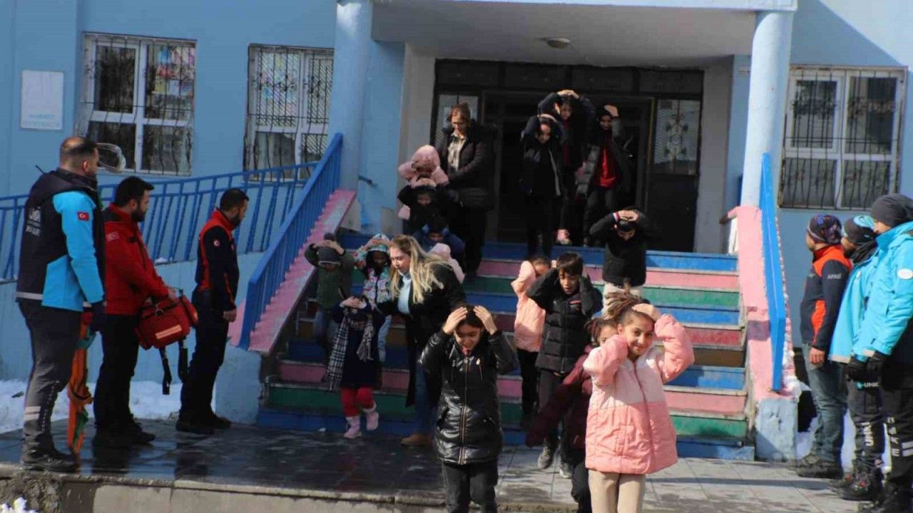 24 sınıflı ve 580 öğrencinin eğitim öğretim gördüğü Cumhuriyet İlk ve Ortaokulunda sınıflarda muhtemel bir depreme karşı yapılabilecek önlemler hakkında uygulamalı olarak bilgi verildi. Verilen deprem alarmıyla idareciler, öğretmenler ve öğrenciler, "çök, kapan, tutun" hareketi ile oluşturdukları güvenli noktada kendilerini korumaya aldı.