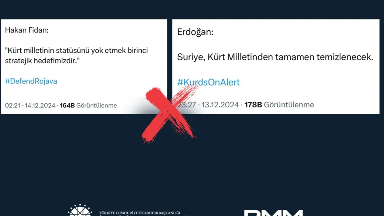 Açıklamada, söz konusu sosyal medya hesaplarından, Cumhurbaşkanı Recep Tayyip Erdoğan ve Dışişleri Bakanı Hakan Fidan'ın açıklaması olduğu iddiasıyla yapılan paylaşımların dezenformasyon olduğu belirtilerek, "Sayın Cumhurbaşkanımız Recep Tayyip Erdoğan'ın ve Dışişleri Bakanı Hakan Fidan'ın iddia edildiği gibi bir açıklaması veya ifadesi bulunmamaktadır. Terör örgütlerinin kamuoyunu provoke etme amaçlı yürüttüğü dezenformasyon kampanyalarına itibar etmeyiniz." ifadeleri yer aldı.