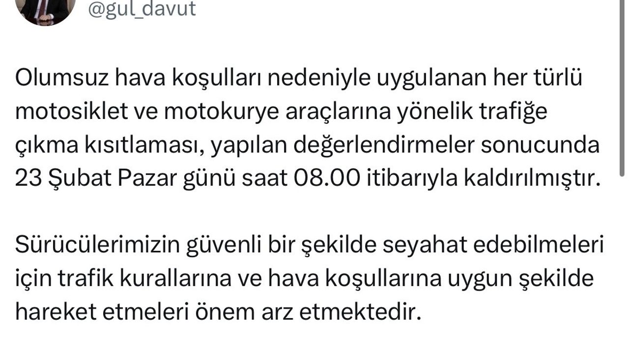 İstanbul Valisi Davut Gül, sosyal medya hesabı üzerinden megakentte uygulanan motokurye kısıtlamasına ilişkin açıklama yaptı. Vali Gül yaptığı açıklamada, "Olumsuz hava koşulları nedeniyle uygulanan her türlü motosiklet ve motokurye araçlarına yönelik trafiğe çıkma kısıtlaması, yapılan değerlendirmeler sonucunda 23 Şubat Pazar günü saat 08.00 itibarıyla kaldırılmıştır. Sürücülerimizin güvenli bir şekilde seyahat edebilmeleri için trafik kurallarına ve hava koşullarına uygun şekilde hareket etmeleri önem arz etmektedir" ifadelerini kullandı.