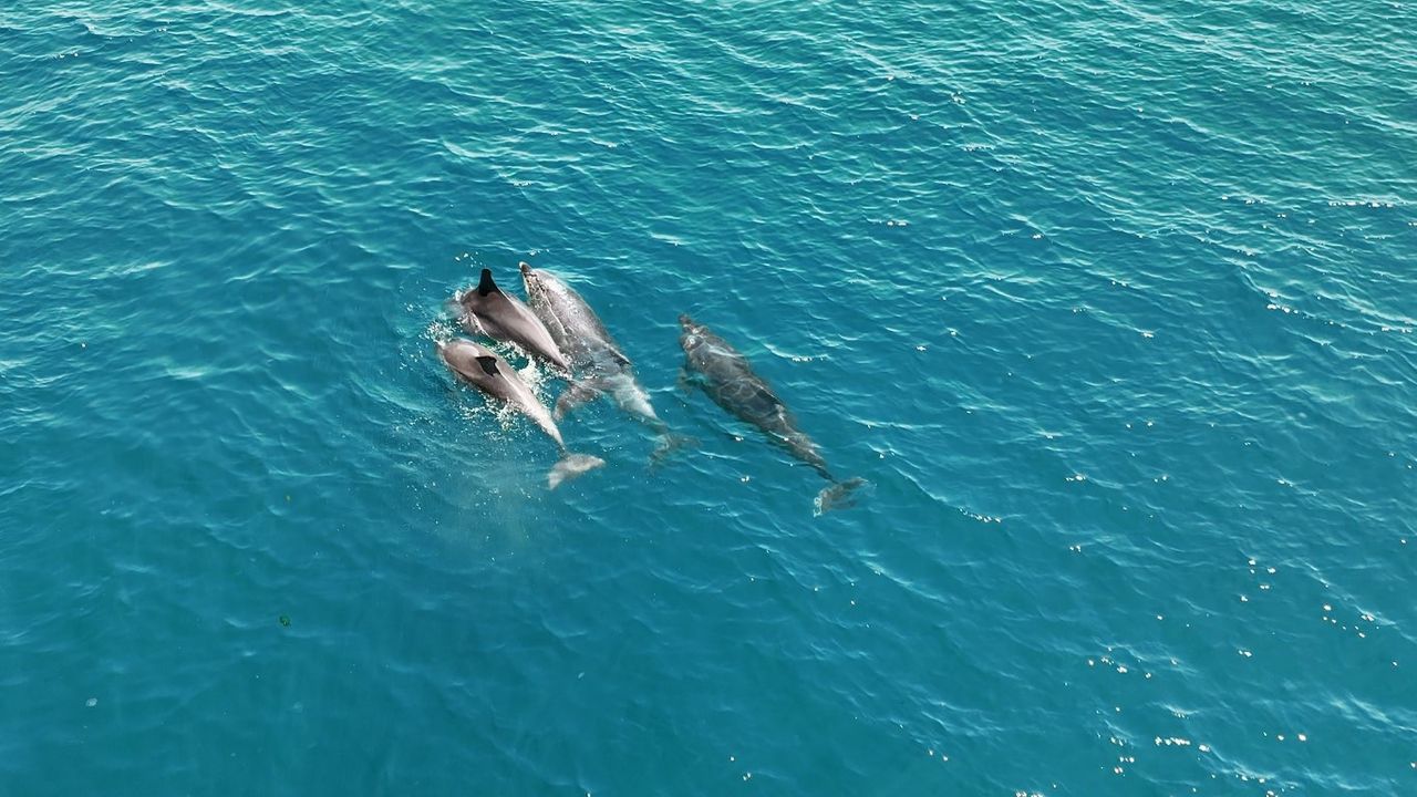 Yunus balıklarının tek olduğu ve avlandığı o özel anlar havadan çekilen görüntülere yansıdı. Balığı yakalamaya çalışan yunus bir süre etrafında dönen balığı avlamaya çalışıyor.