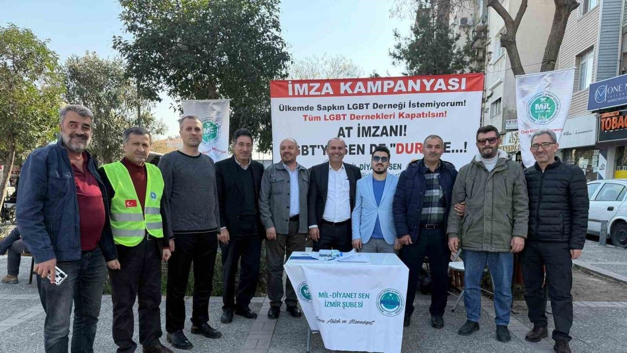 İzmir’de toplanan Manevi İlkeli Liyakatli Diyanet ve Vakıf Çalışmaları Sendikası (Mil-Diyanet Sen) üyeleri, LGBT derneklerinin kapatılması için imza kampanyası başlattı.