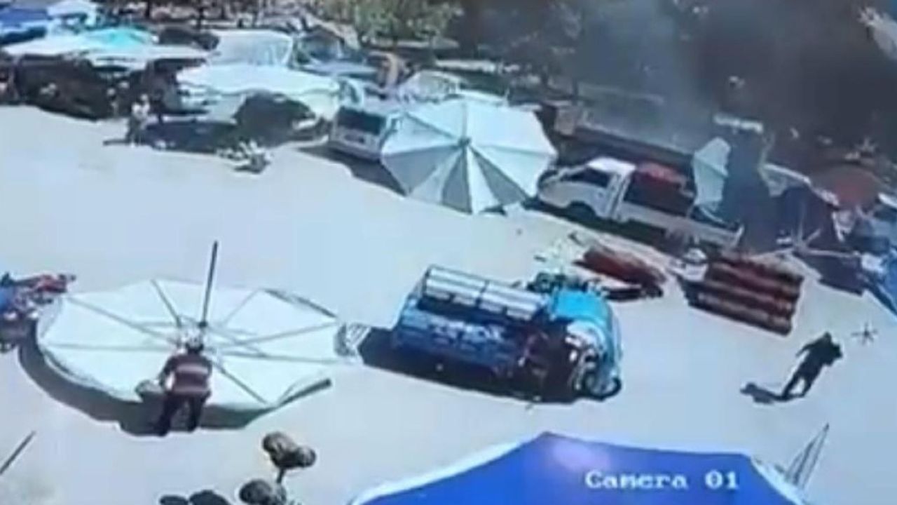 Öte yandan, yaşananlar çevredeki bir güvenlik kamerası tarafından kaydedildi. Görüntülerde, hamile kadının bebek arabasıyla pazar alanına gelişi, şemsiyelerin rüzgarla savrulması ve şemsiyenin üzerlerine düşme anı yer aldı.