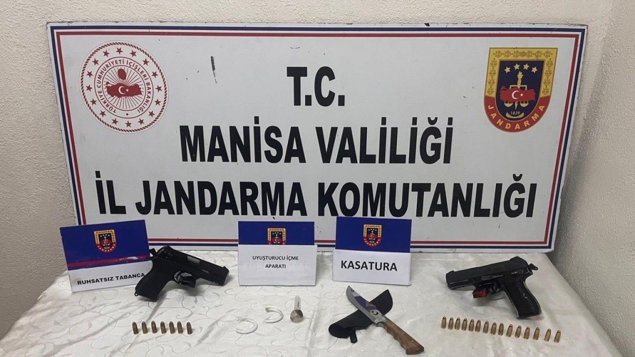 Manisa’nın Akhisar ilçesinde jandarma ekipleri tarafından yapılan asayiş uygulamasında 2 adet ruhsatsız tabanca, tabancalara ait fişekler, bıçak ve uyuşturucu içme aparatları ele geçirildi.