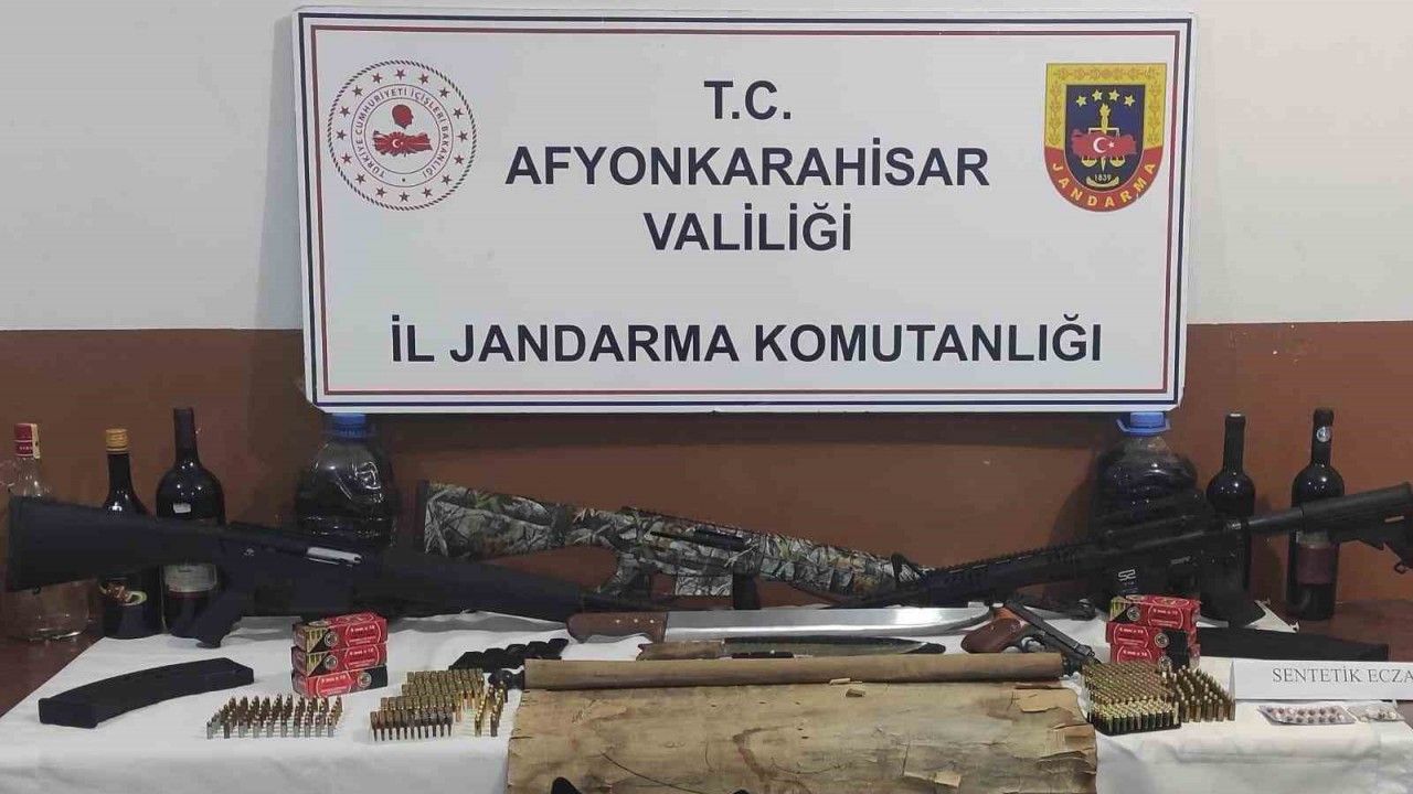 Afyonkarahisar İl Jandarma Komutanlığı ekipleri Sinanpaşa İlçesi Tınaztepe Beldesinde faaliyet gösteren bir işletmede uyuşturucu ve kaçak alkol bulundurdukları yönünde bilgi aldı. Bunun üzerine, Jandarma Suç Araştırma Dedektiflerince (JASAT) söz konusu işletme sahibinin ev ve eklentilerine bakın yapıldı. Adreslerde arama yapan ekipler 17 adet sentetik ecza, ruhsatsız tabanca, 3 ruhsatsız tüfek, tarihi eser niteliği taşıyan harita, 16 litre sahte, kaçak alkol 3 adet bıçak ve 532 mermi ele geçirildi. Olayın ardından gözaltına alınan T.A., B.M., N.A. ve U.A. isimli şahıslar ifadeleri alındıktan sonra serbest bırakılırken, ayrıca işletmede yapılan kimlik kontrolünde ikamet izni sona erdiği tespit edilen B.A. isimli İran uyruklu kadına 32 bin 864 TL idari para cezası uygulanıp, Afyonkarahisar İl Göç İdaresi Müdürlüğüne teslim edildiği bildirildi.