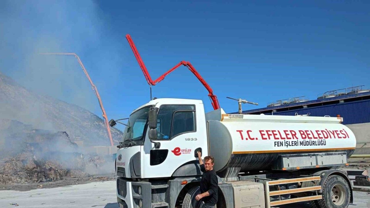 Aydın’ın Söke ilçesinde faaliyet gösteren Kipaş Kağıt Fabrikası’nın atık depolama alanında çıkan yangını söndürme çalışmaları devam ederken, Efeler Belediyesi’ne ait su tankerleri de söndürme çalışmalarına destek veriyor.