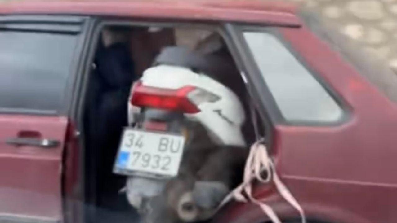 Bursa’da cadde üzerinde kapısız araçla trafiğe çıkan sürücü, arka koltuğa koyduğu motosikleti taşıdı. Trafiği tehlikeye düşüren sürücüyü görenler şaşkına dönerken, bazı sürücüler o anları amatör kamerayla kayda aldı. Kilometrelerce ilerleyen sürücü bir süre sonra kayıplara karışırken, görüntüler üzerine Trafik Şube Müdürlüğü ekipleri harekete geçti.