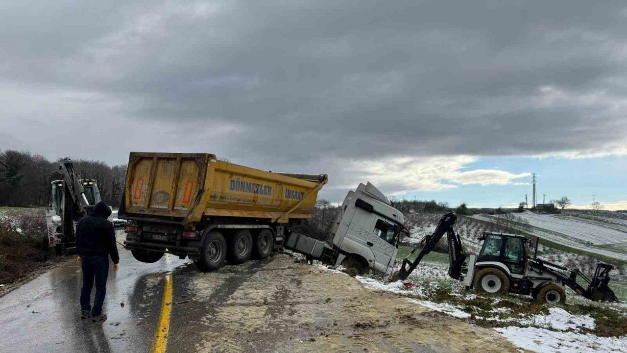 Kaza, Esentepe mevkiinde meydana geldi. Malzemeyüklü hafriyat kamyonuyağan karla birlikte yolun kayganlaşması üzerine, sürücüsünün