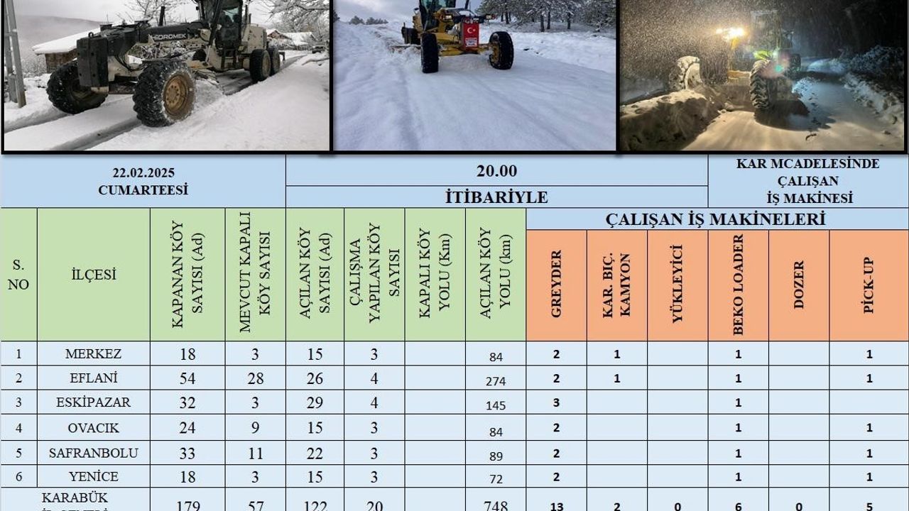 Karabük Valiliği’nden yapılan açıklamada, "21 Şubat 2025 Cuma günü ilimizde etkili olan yoğun kar yağışı sonrası 179 köy yolumuz ulaşıma kapanmıştır. İl Özel İdaremize bağlı ekiplerimiz, 26 iş makinesi ve 74 personel ile aralıksız çalışarak 748 km uzunluğundaki 122 köy yolunu yeniden ulaşıma açmış bulunmaktadır" denildi.