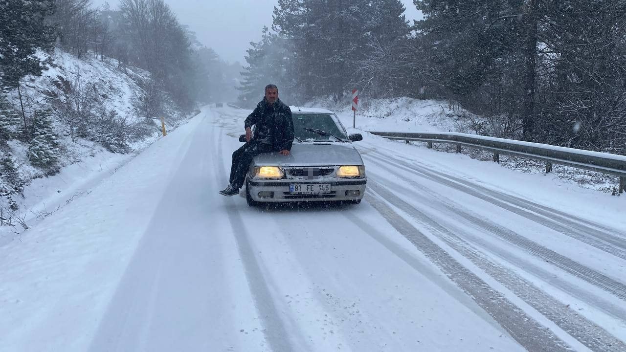 Gece saatlerinden itibaren etkili olan kar yağışıyla ilçe merkezi karla kaplandı. Yokuş aşağıya şambrel ile kayan 2 vatandaş cep telefonu kamerasıyla görüntülendi. Vatandaşların kayak keyfi park halindeki otomobile çarparak son buldu.